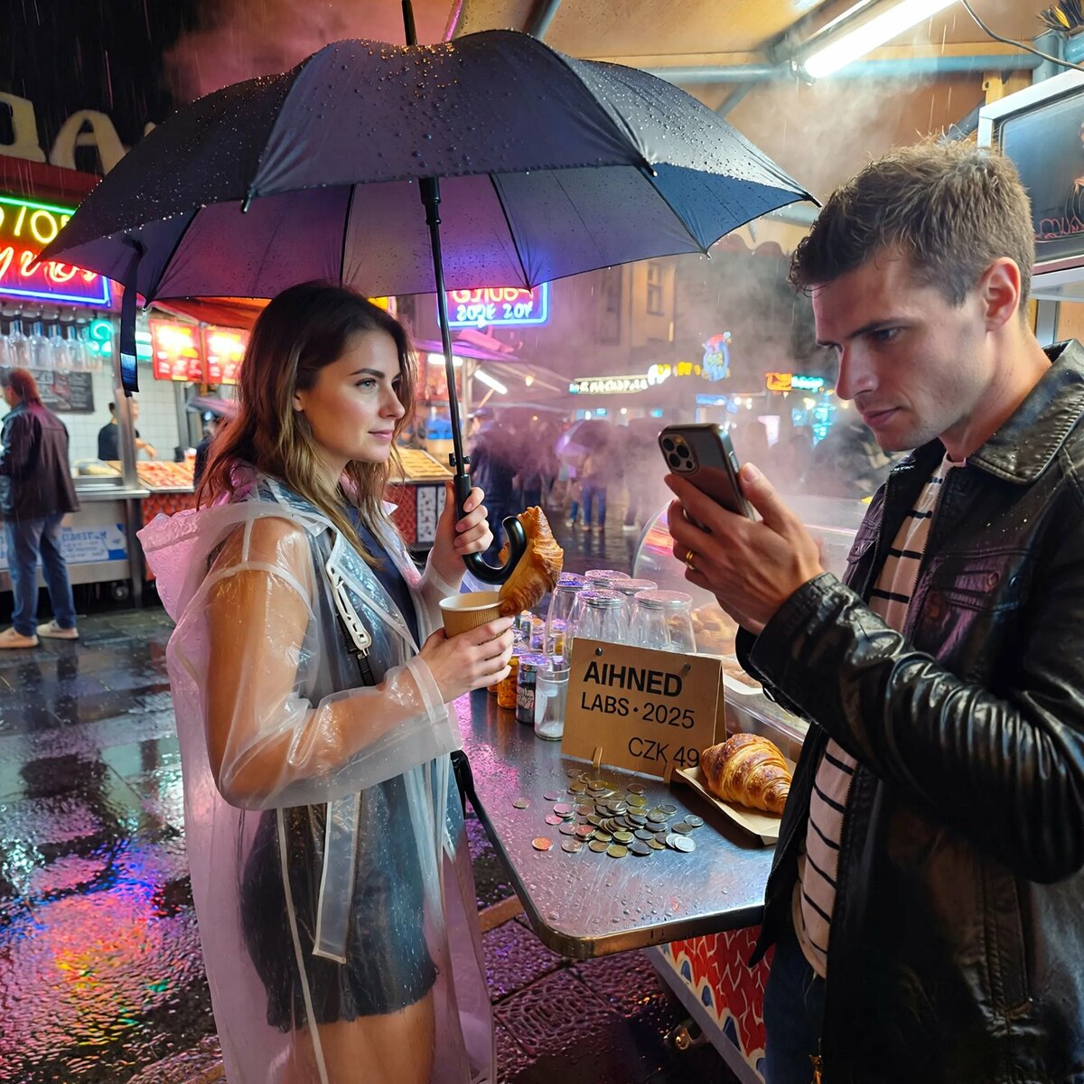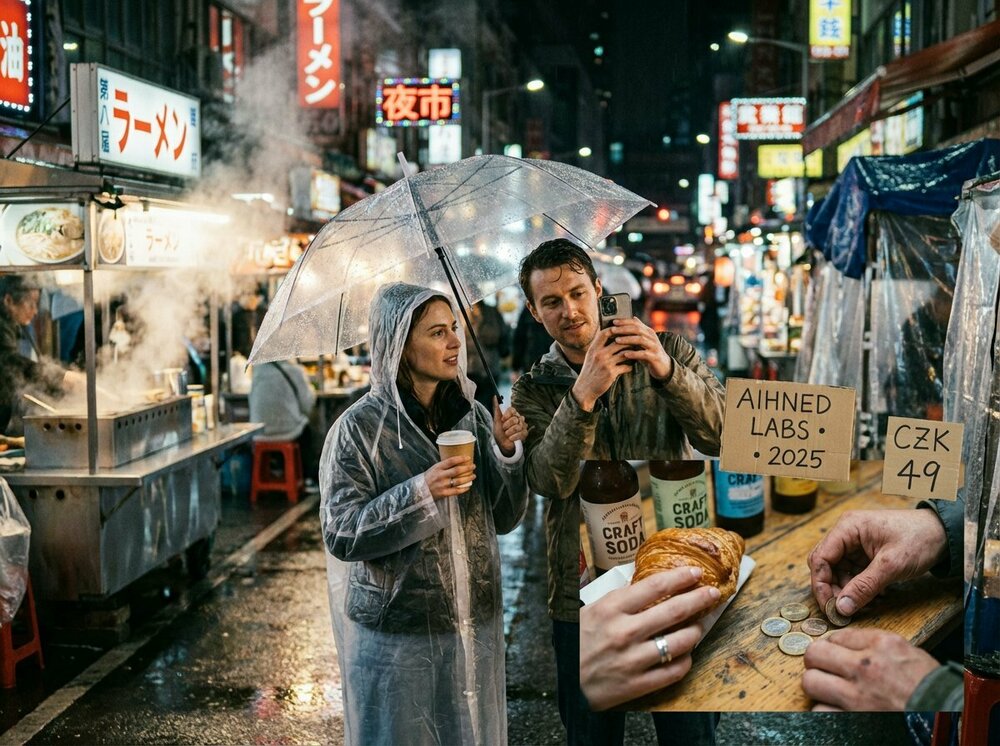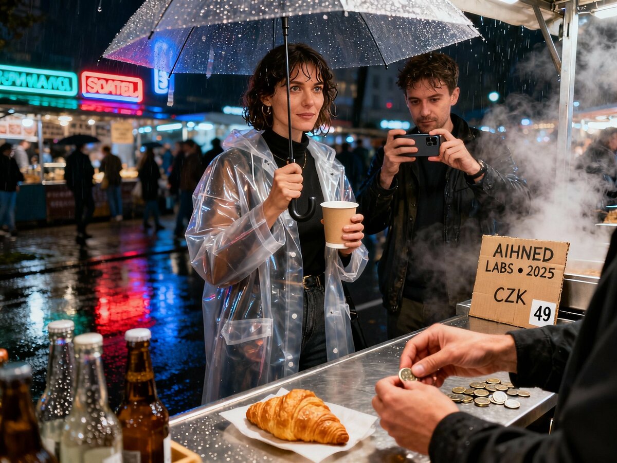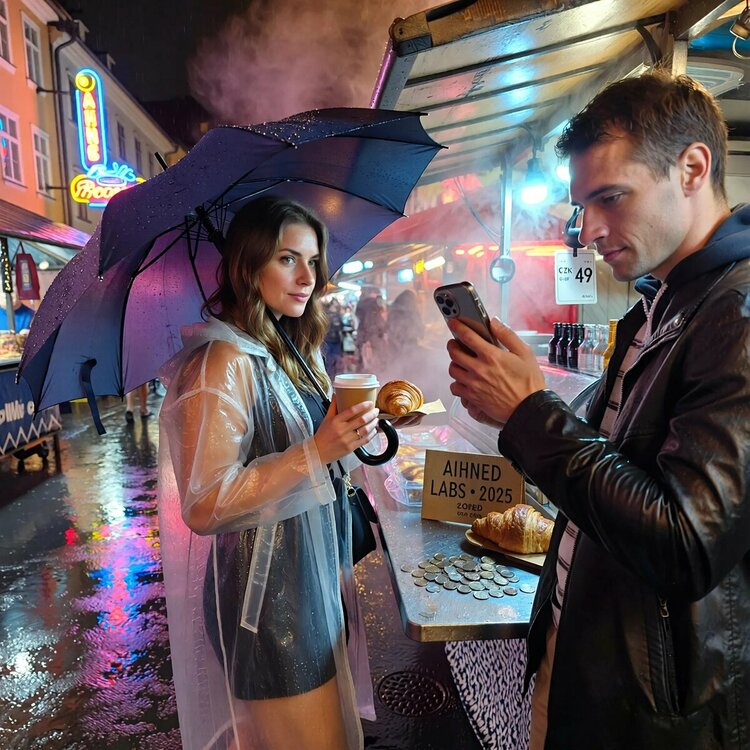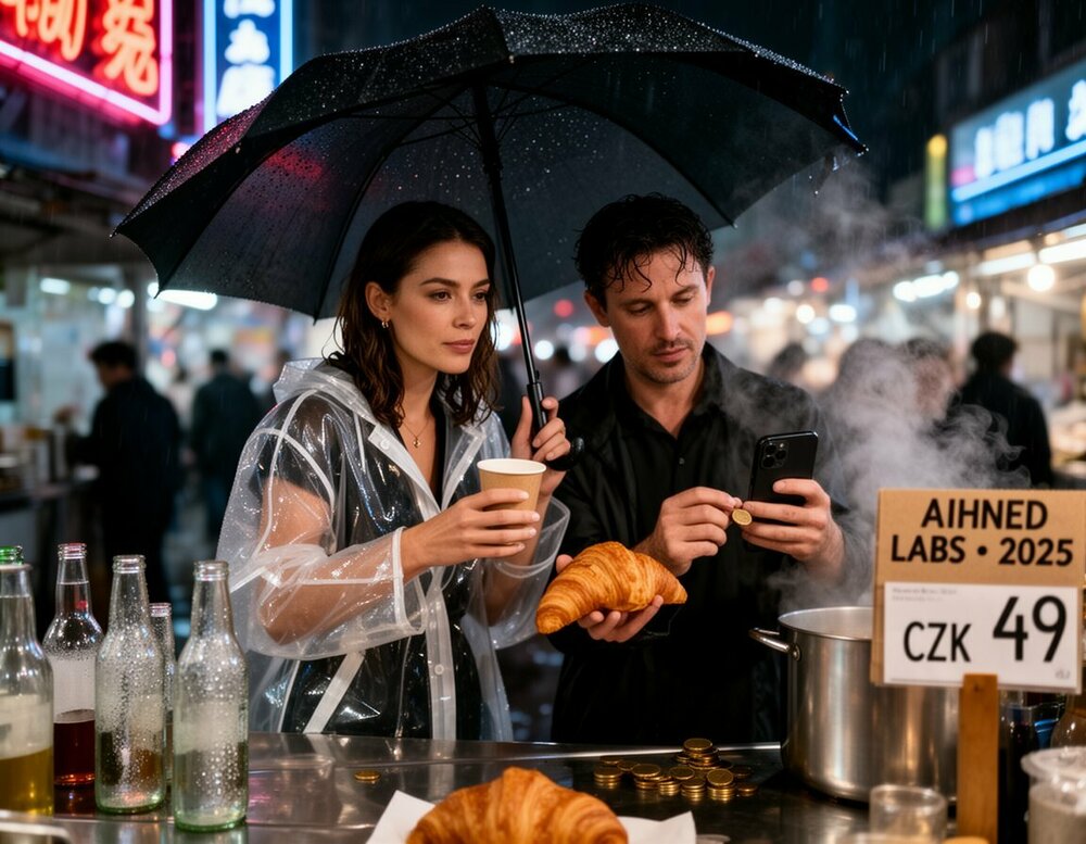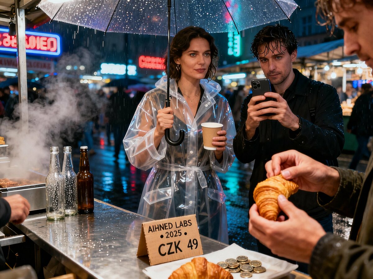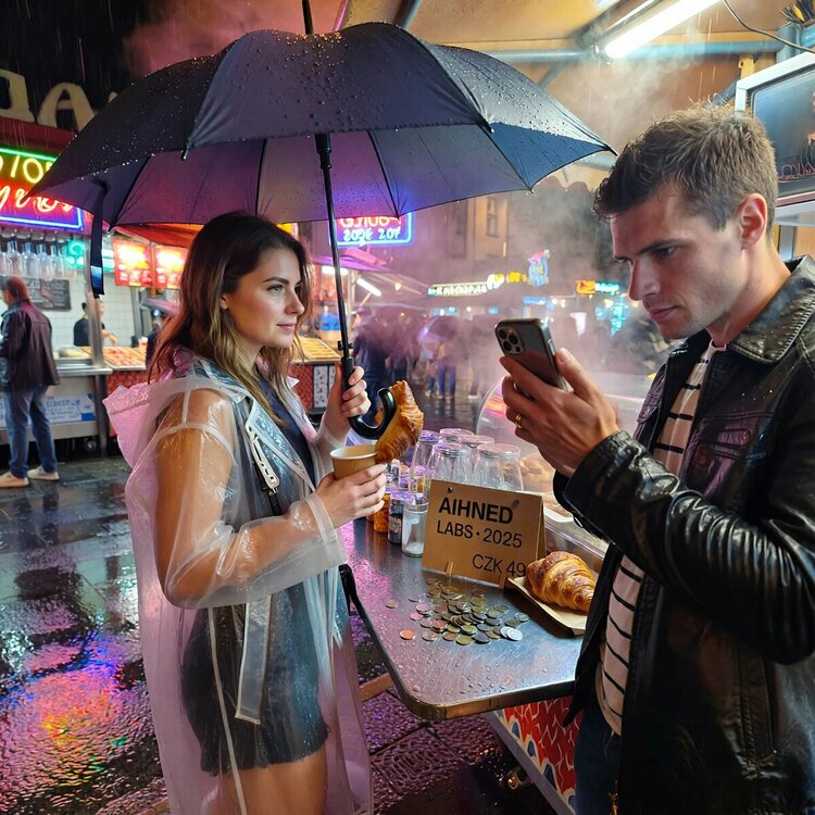 Anonymní zveřejnil(a) obrázek v galerii v Obrázky — AIHNED výstupyModel: Nano Banana 2 Pro Požadavek: Filmová ultra-realistická fotografie rušného nočního pouličního marketu za slabého deště, neonové nápisy se odrážejí v mokrém asfaltu, ze stánků stoupá pára. Uprostřed: stylová dospělá žena v průhledném plášti do deště drží deštník a papírový kelímek; vedle ní dospělý muž fotí na smartphone; oba s přirozenou texturou pleti a ostrýma očima. Zahrň detailní ruce: jedna ruka drží croissant, druhá ruka počítá mince. Smíšené materiály: skleněné láhve s kondenzací, broušený kovový pult, lesklý plast, látka, mokré vlasy, drobné kapky vody na deštníku. V pozadí bokeh, ale čitelné nápisy. Do scény přidej malou kartonovou cedulku s přesně a čitelně uvedeným textem: „AIHNED LABS • 2025“ a jasnou cenovku „CZK 49“. Reálný objektiv: 35mm, malá hloubka ostrosti, vysoký dynamický rozsah, přesné odrazy, přirozené barevné ladění, bez vodoznaku. Negative: nízké rozlišení, rozmazané, ztracené detaily, příliš vyhlazená pleť, deformovaná anatomie, extra prsty, chybějící prsty, špatné ruce, špatné oči, asymetrie, pokřivené objekty, nesmyslný text, překlepy, logo, vodoznak, silné artefakty, přesaturované barvy Seed: 605677757 (náhodný) Vytvořeno v AIHNED. Sdíleno anonymně. -