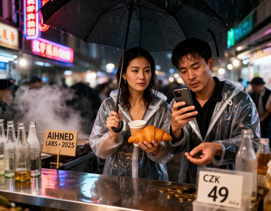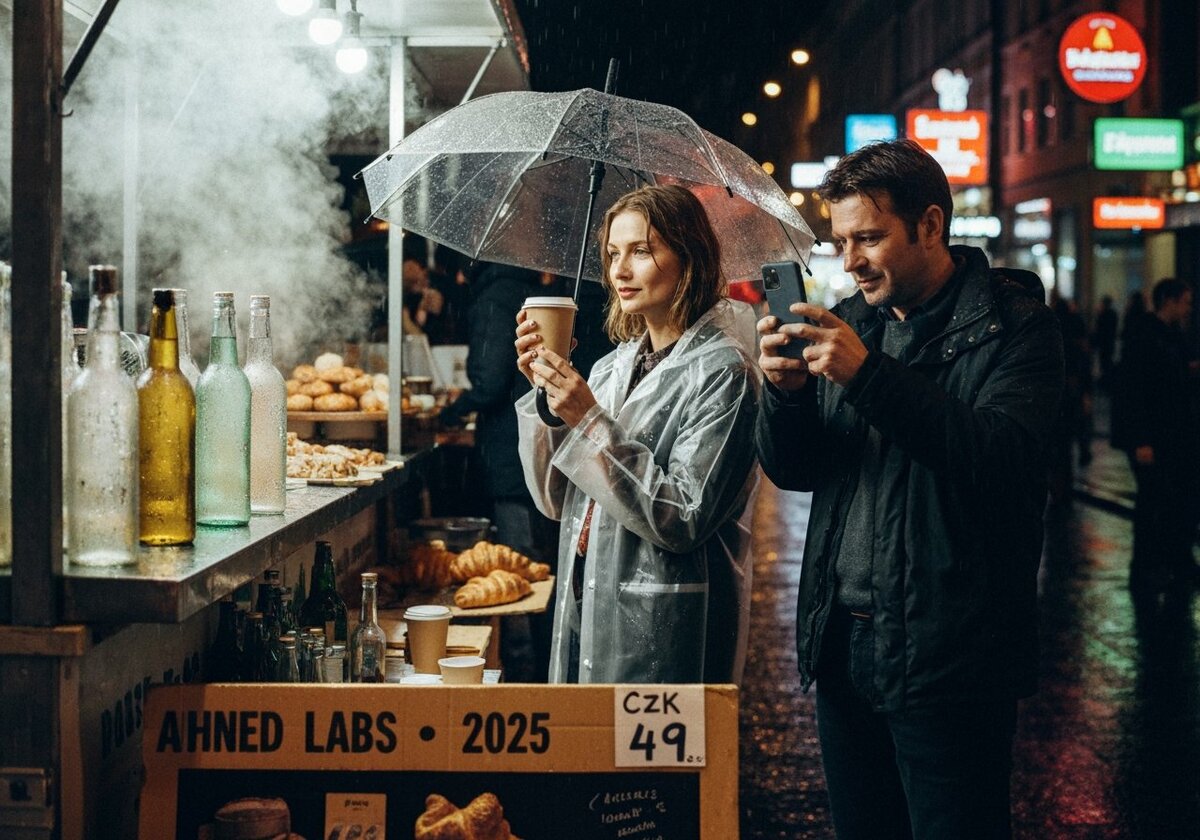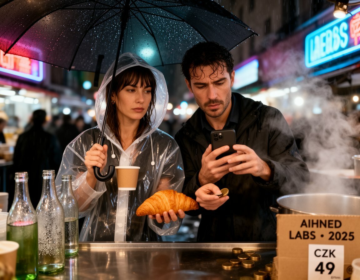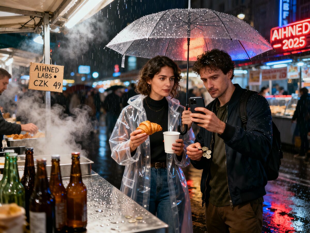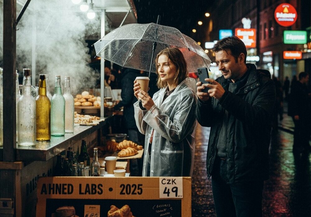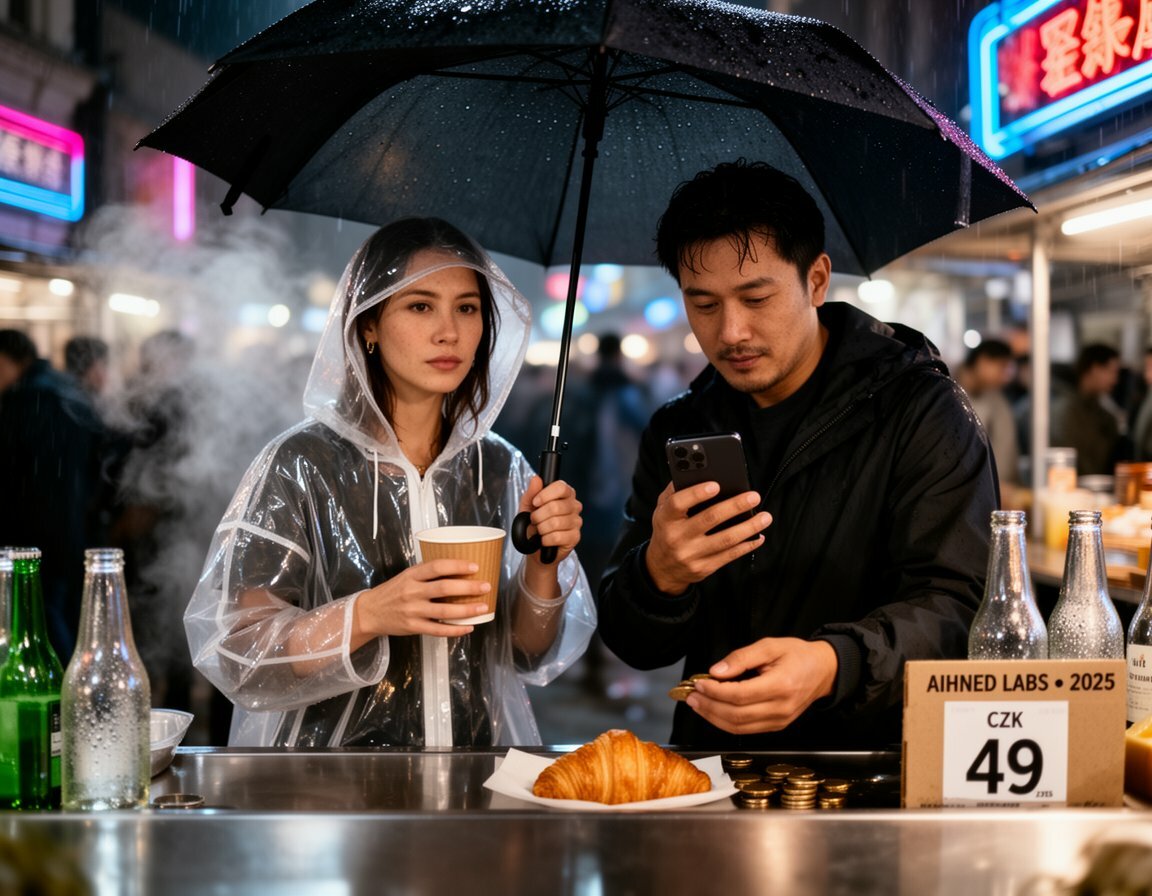Anonymní zveřejnil(a) obrázek v galerii v Obrázky — AIHNED výstupyModel: Nano Banana 2 Pro Požadavek: Filmová ultra-realistická fotografie rušného nočního pouličního marketu za slabého deště, neonové nápisy se odrážejí v mokrém asfaltu, ze stánků stoupá pára. Uprostřed: stylová dospělá žena v průhledném plášti do deště drží deštník a papírový kelímek; vedle ní dospělý muž fotí na smartphone; oba s přirozenou texturou pleti a ostrýma očima. Zahrň detailní ruce: jedna ruka drží croissant, druhá ruka počítá mince. Smíšené materiály: skleněné láhve s kondenzací, broušený kovový pult, lesklý plast, látka, mokré vlasy, drobné kapky vody na deštníku. V pozadí bokeh, ale čitelné nápisy. Do scény přidej malou kartonovou cedulku s přesně a čitelně uvedeným textem: „AIHNED LABS • 2025“ a jasnou cenovku „CZK 49“. Reálný objektiv: 35mm, malá hloubka ostrosti, vysoký dynamický rozsah, přesné odrazy, přirozené barevné ladění, bez vodoznaku. Negative: nízké rozlišení, rozmazané, ztracené detaily, příliš vyhlazená pleť, deformovaná anatomie, extra prsty, chybějící prsty, špatné ruce, špatné oči, asymetrie, pokřivené objekty, nesmyslný text, překlepy, logo, vodoznak, silné artefakty, přesaturované barvy Seed: 605677757 (náhodný) Vytvořeno v AIHNED. Sdíleno anonymně. -