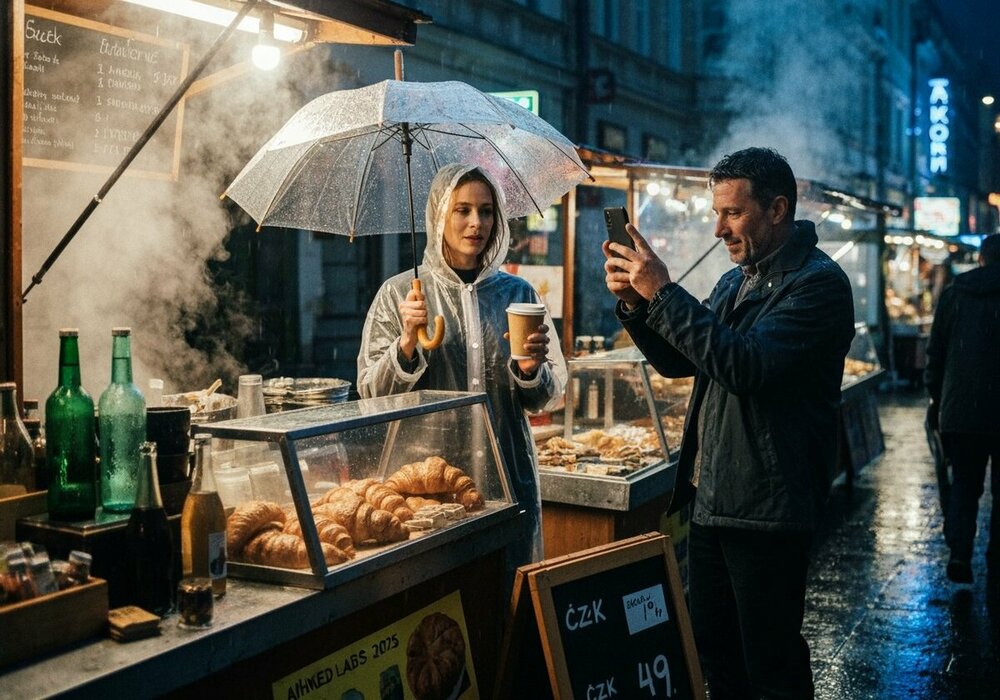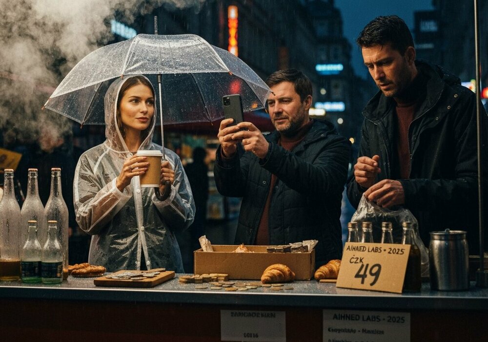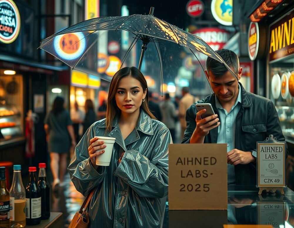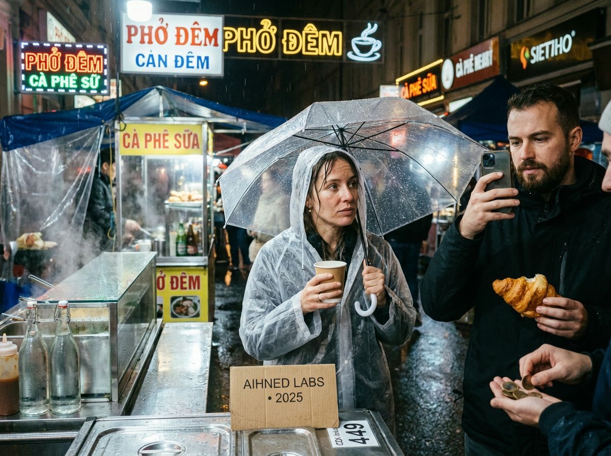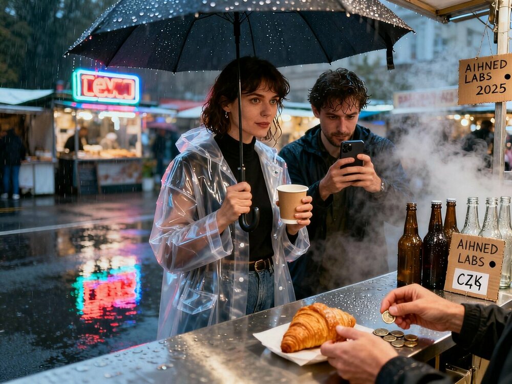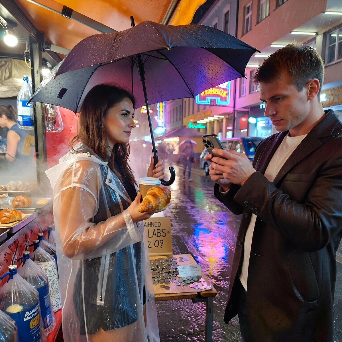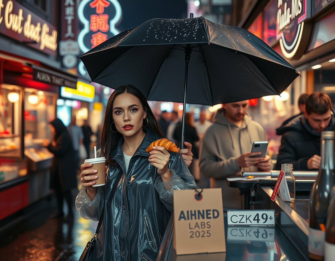 Anonymní zveřejnil(a) obrázek v galerii v Obrázky — AIHNED výstupyModel: Nano Banana 2 Pro Požadavek: Filmová ultra-realistická fotografie rušného nočního pouličního marketu za slabého deště, neonové nápisy se odrážejí v mokrém asfaltu, ze stánků stoupá pára. Uprostřed: stylová dospělá žena v průhledném plášti do deště drží deštník a papírový kelímek; vedle ní dospělý muž fotí na smartphone; oba s přirozenou texturou pleti a ostrýma očima. Zahrň detailní ruce: jedna ruka drží croissant, druhá ruka počítá mince. Smíšené materiály: skleněné láhve s kondenzací, broušený kovový pult, lesklý plast, látka, mokré vlasy, drobné kapky vody na deštníku. V pozadí bokeh, ale čitelné nápisy. Do scény přidej malou kartonovou cedulku s přesně a čitelně uvedeným textem: „AIHNED LABS • 2025“ a jasnou cenovku „CZK 49“. Reálný objektiv: 35mm, malá hloubka ostrosti, vysoký dynamický rozsah, přesné odrazy, přirozené barevné ladění, bez vodoznaku. Negative: nízké rozlišení, rozmazané, ztracené detaily, příliš vyhlazená pleť, deformovaná anatomie, extra prsty, chybějící prsty, špatné ruce, špatné oči, asymetrie, pokřivené objekty, nesmyslný text, překlepy, logo, vodoznak, silné artefakty, přesaturované barvy Seed: 605677757 (náhodný) Vytvořeno v AIHNED. Sdíleno anonymně. -