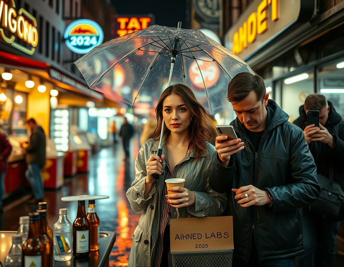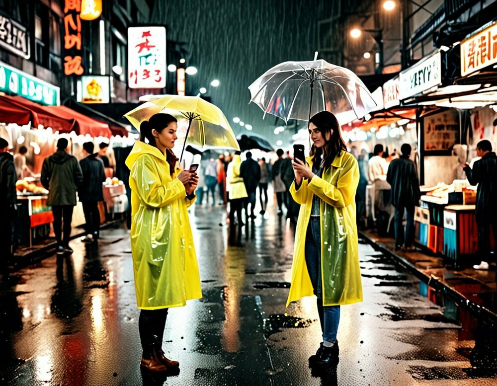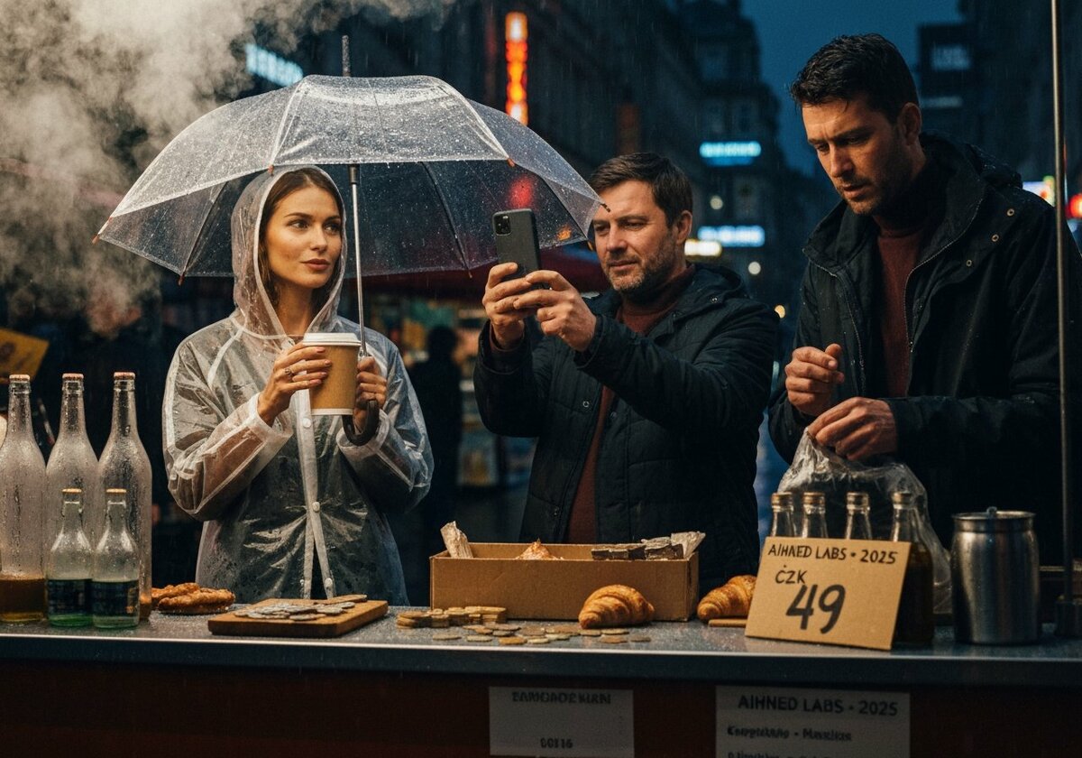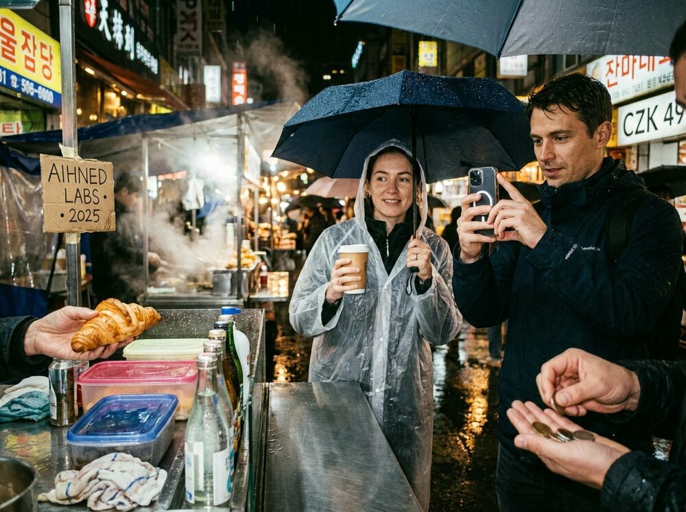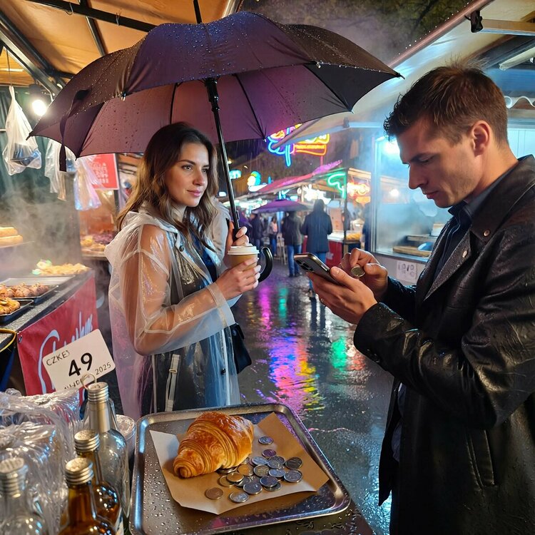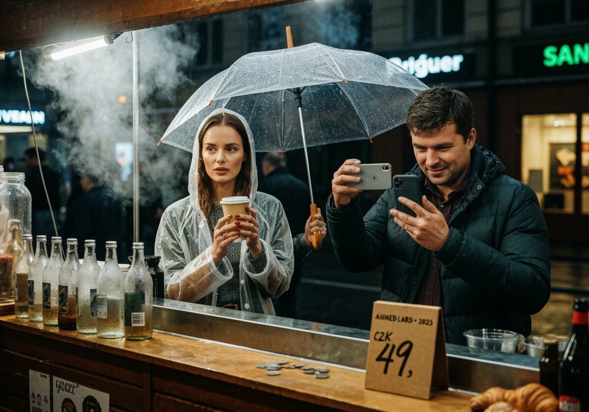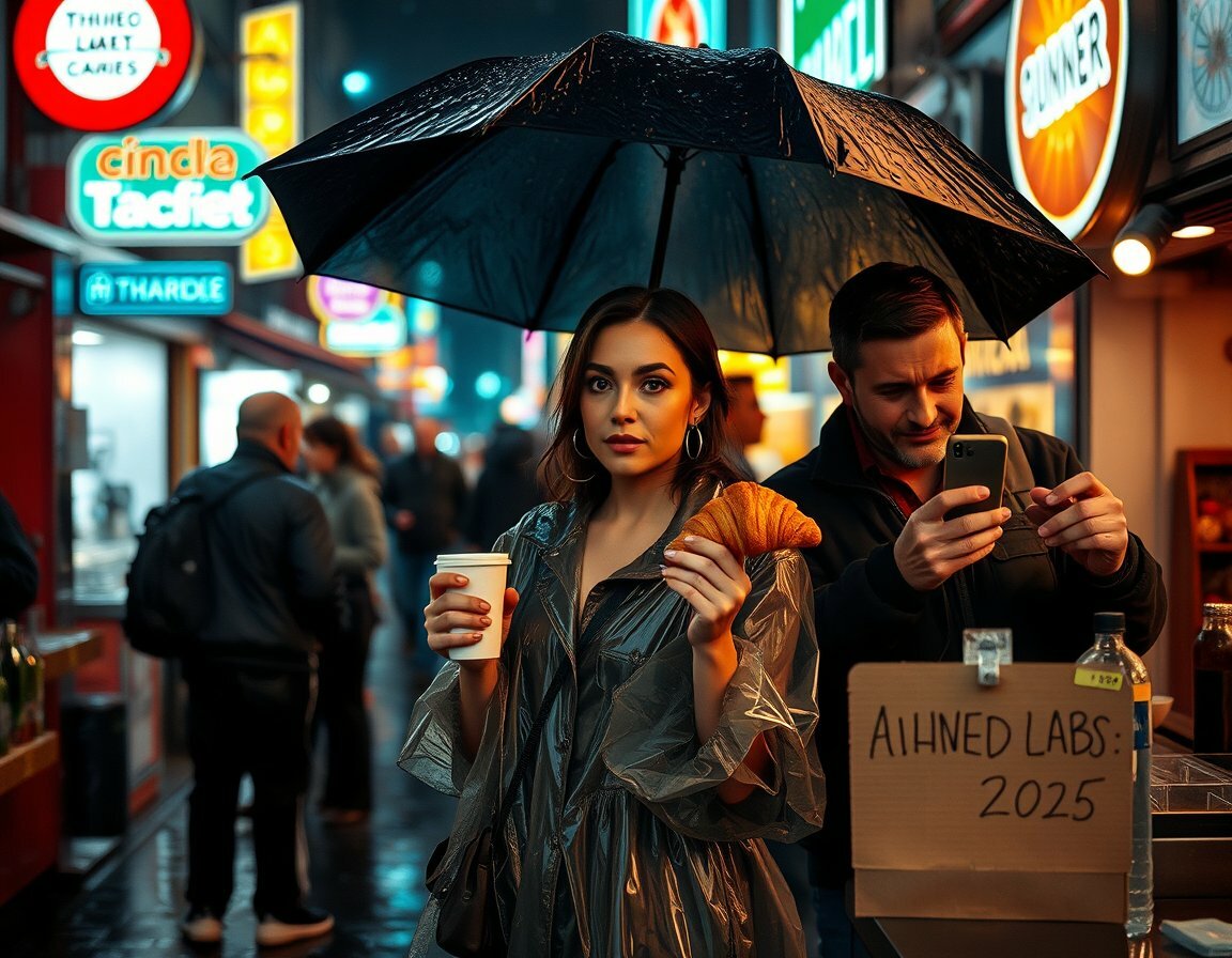 Anonymní zveřejnil(a) obrázek v galerii v Obrázky — AIHNED výstupyModel: Nano Banana 2 Pro Požadavek: Filmová ultra-realistická fotografie rušného nočního pouličního marketu za slabého deště, neonové nápisy se odrážejí v mokrém asfaltu, ze stánků stoupá pára. Uprostřed: stylová dospělá žena v průhledném plášti do deště drží deštník a papírový kelímek; vedle ní dospělý muž fotí na smartphone; oba s přirozenou texturou pleti a ostrýma očima. Zahrň detailní ruce: jedna ruka drží croissant, druhá ruka počítá mince. Smíšené materiály: skleněné láhve s kondenzací, broušený kovový pult, lesklý plast, látka, mokré vlasy, drobné kapky vody na deštníku. V pozadí bokeh, ale čitelné nápisy. Do scény přidej malou kartonovou cedulku s přesně a čitelně uvedeným textem: „AIHNED LABS • 2025“ a jasnou cenovku „CZK 49“. Reálný objektiv: 35mm, malá hloubka ostrosti, vysoký dynamický rozsah, přesné odrazy, přirozené barevné ladění, bez vodoznaku. Negative: nízké rozlišení, rozmazané, ztracené detaily, příliš vyhlazená pleť, deformovaná anatomie, extra prsty, chybějící prsty, špatné ruce, špatné oči, asymetrie, pokřivené objekty, nesmyslný text, překlepy, logo, vodoznak, silné artefakty, přesaturované barvy Seed: 605677757 (náhodný) Vytvořeno v AIHNED. Sdíleno anonymně. -