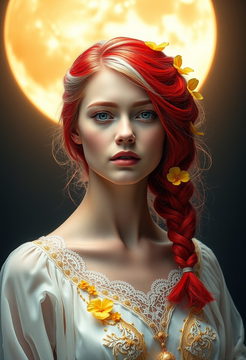 Požadavek: Ultra detailní realistický portrét dospělé ženy (cca 25 let) s porcelánově světlou pletí. Vlasy jasně červené a sněhově bílé spletené do copu, zdobené žlutými květy. Stojí proti zářícímu úplňku. Na sobě má vzdušné, neprůhledné bílé krajkové šaty s jemným pohybem, subtilní akcenty krajky v neonově červené a žluté barvě. Éterické měkké světlo vytváří jemný halo efekt, decentní stíny a křehké rysy.