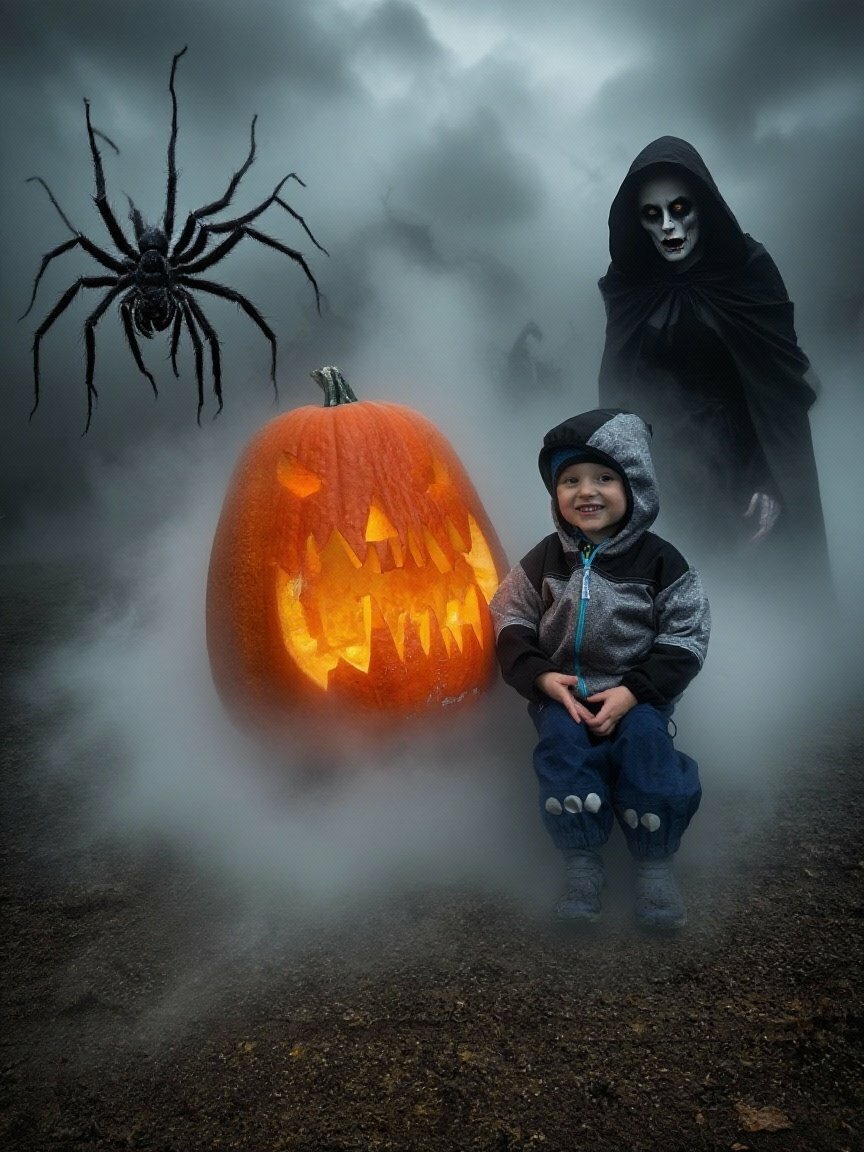 Požadavek: halloweenské horrorové prostředí, mlha u země, jako z filmu. ponechat velkou dýni ktera může vypadat živě a chlapce neupravovat. v pozadí monstrózní strašidelný pavouk a čarodějnice, zvol vlastni pozadí
