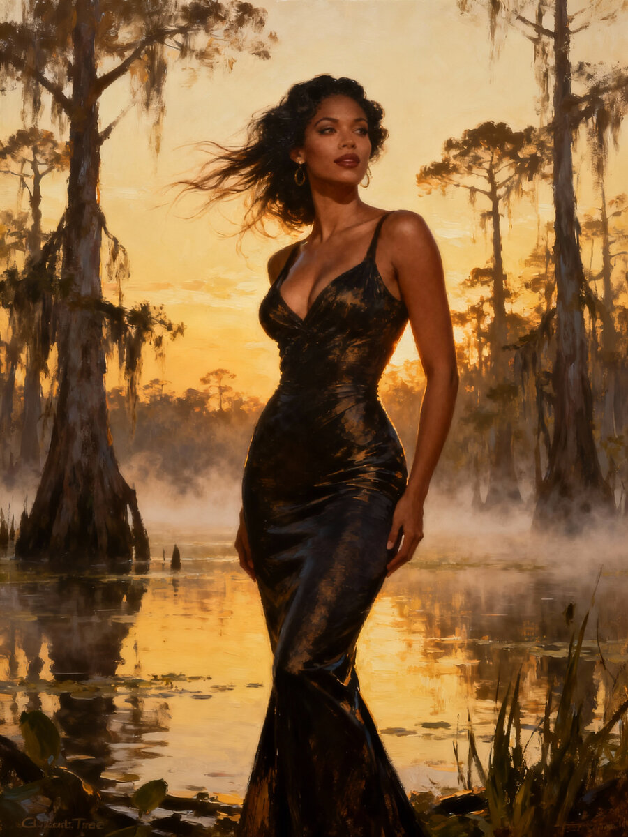 Požadavek: Hyper-detailní celopostavový portrét vášnivé kreolské ženy, sebejistý výraz a jemně koketní pohled. Elegantní, přiléhavé šaty zvýrazňující siluetu, decentní póza jako filmový plakát, vlasy lehce rozfoukané větrem ::5 Realistické malířské pozadí ::4 – krajina při zlaté hodině u pobřežního bayou, siluety cypřišů nad vodou, jemná mlha, teplé přírodní tóny. Výrazné tahy štětcem, expresivní textura, luxusní galerijní plátno, sběratelská limitovaná edice, umělecký styl Glibatree ::3. Profesionální nasvícení, mělká hloubka ostrosti, dokonalá kompozice, velmi vysoké rozlišení.