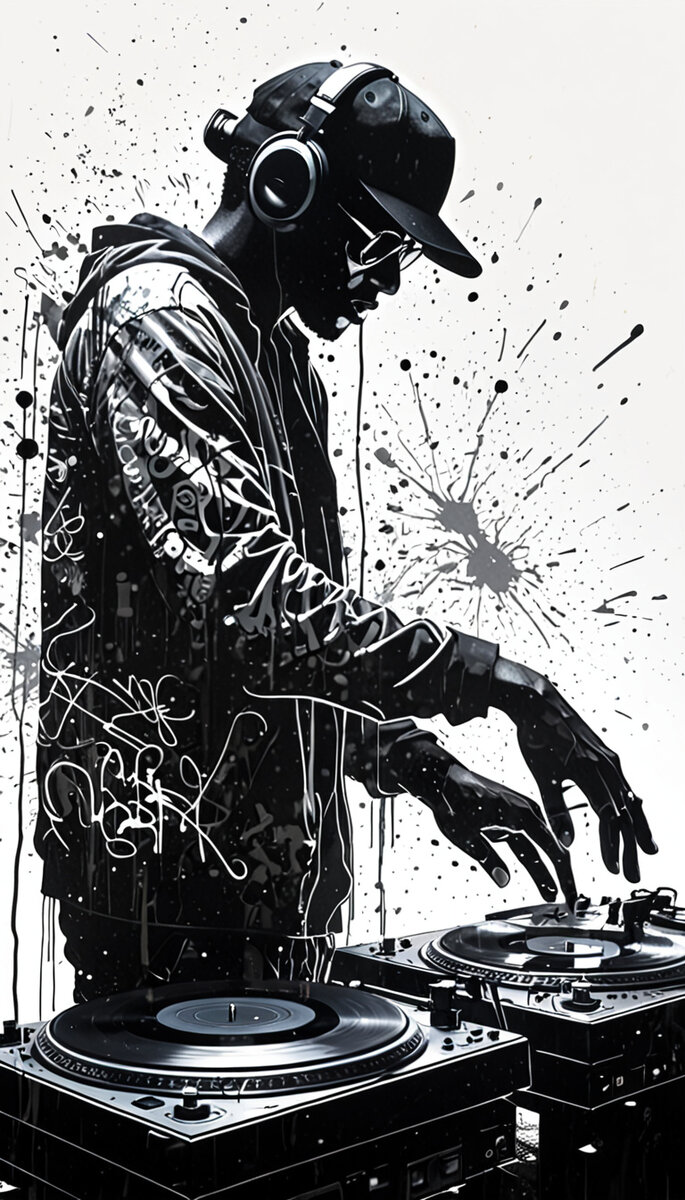 Požadavek: Dvojitá expozice gramofonů, na které hraje silueta muže, DJing a graffiti: tmavé a drsné, bílé pozadí, složitě detailní, hyperdetailní, realismus; neuvěřitelná kompozice; dynamické osvětlení; pečlivě komponované konceptuální umění, mistrovské dílo, digitální ilustrace, odrazy, cel-shaded, volumetrické osvětlení