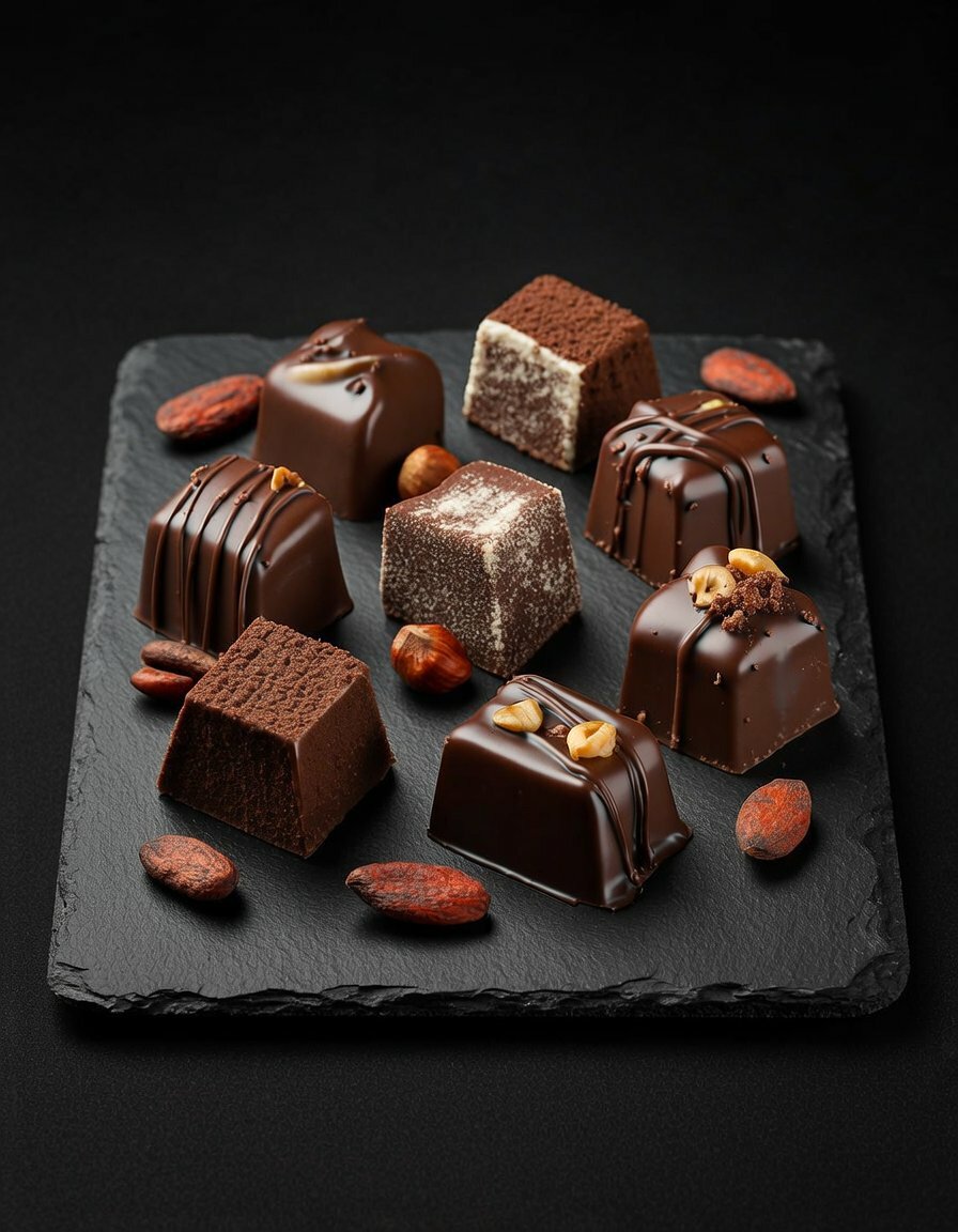 Požadavek: Profesionální produktová fotografie ručně vyráběných čokoládových pralinek na tmavém pozadí, měkké studiové světlo, jemné odlesky, ostré detaily textury čokolády, několik pralinek rozložených na břidlicové desce, pár kakaových bobů a oříšků okolo, vhodné pro e-shop a reklamní bannery, high detail, commercial photo.