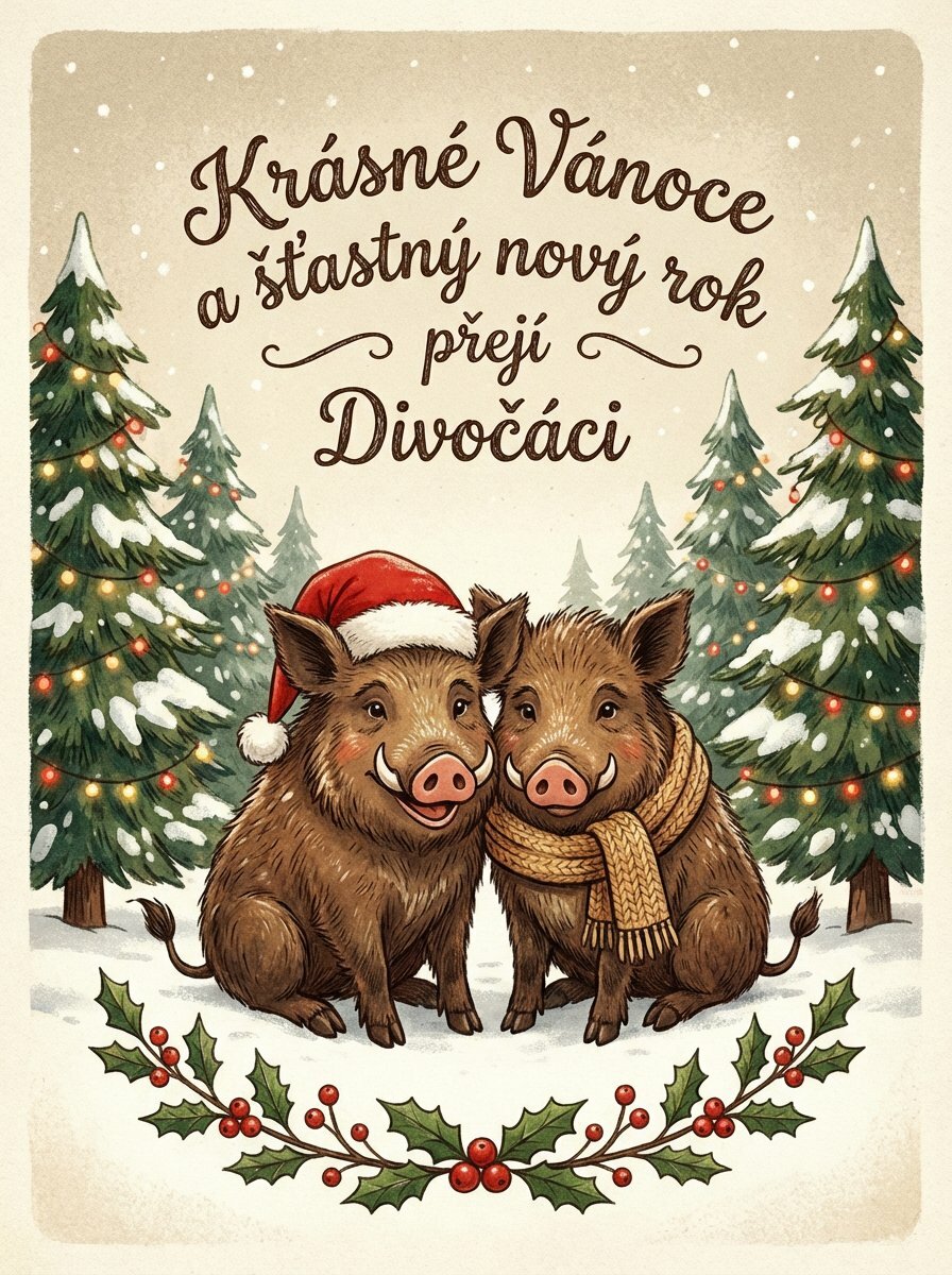 Požadavek: xmass card with two hogs and text: krásné vánoce a šťastný nový rok přejí Divočáci