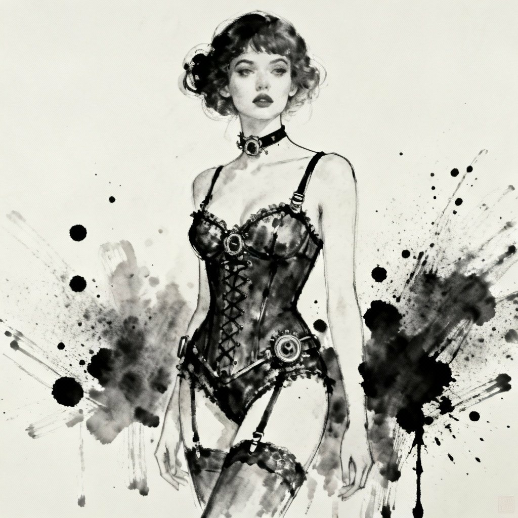 Požadavek: Ilustrace smyslné dámy oblékající se do spodního prádla ve steampunk stylu. Celá scéna je obklopena dynamickými černými skvrnami a flekmi, které vytvářejí umělecký a éterický dojem, jako by byl obraz právě namalován. Celý obraz je ručně kreslen s pocitem hloubky a jemnosti, připomínající ilustraci inkoustem: čisté tmavé linie, vysoký kontrast a minimalistický nádech. Kresba uhlem, silné rozmazání, přerušované stínování, hrubé textury, tmavé prašné stíny, chaotické tahy, žádné čisté linie, syrový vzhled.