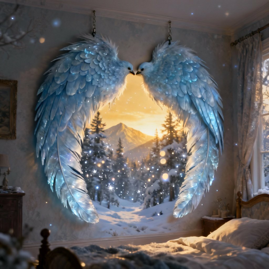 Požadavek: Hyperrealistická a éterická snová surrealistická scéna. Prostředím je teplá útulná místnost, kde klid snů navozuje ospalou atmosféru. Na zdi visí dvě nadrozměrná, ledově modrá, matná, magická zimní ptačí pera, která se dotýkají svými špičkami. V prostoru mezi pery je pohled do jiného světa s zasněženým lesem, třpytivými detaily, bokeh efektem a zlatým hodinovým světlem za horami. Vysoké rozlišení, filmové osvětlení, fantasy digitální umění ve stylu digitální matné malby s atmosférickou hloubkou a propracovanými detaily připomínajícími díla Noaha Bradleyho, Kiliana Enga a Craiga Mullinse.