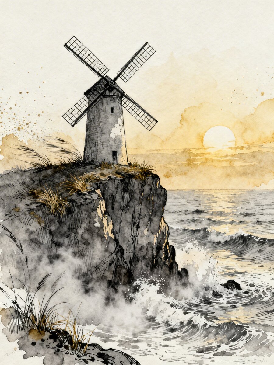 Požadavek: Ilustrace inkoustem a akvarelem. Osamělý větrný mlýn stojí na skalnatém mořském útesu. Pod útesem se tříští oceánské vlny. Kolem základny větrného mlýna se vine mořská mlha. Na stěně útesu a kolem základny větrného mlýna roste větrem ošlehaná tráva. Ručně kreslený vzhled. Tenké jemné linky inkoustu, minimální šrafování, tmavě šedý layout inkoustu (ne čistě černý), čtyři lopatky větrného mlýna rovnoměrně rozmístěné s čistým mřížkovým vzorem, okraje akvarelu mokré na mokré, jemné rozpíjení pigmentu, slunce jako jemná akvarelová záře (ne tvrdý kruh), viditelná textura papíru, žádný fotorealismus, žádný vektor. Čisté linky černého inkoustu s volnými akvarelovými layery. Viditelná textura akvarelového papíru s jemnou granulací a efekty stříkance. Tlumená barevná paleta západu slunce s jemným zlatým světlem. Čtyři lopatky, rovnoměrně rozmístěné, čistý mřížkový vzor, přesná perspektiva. Uměle